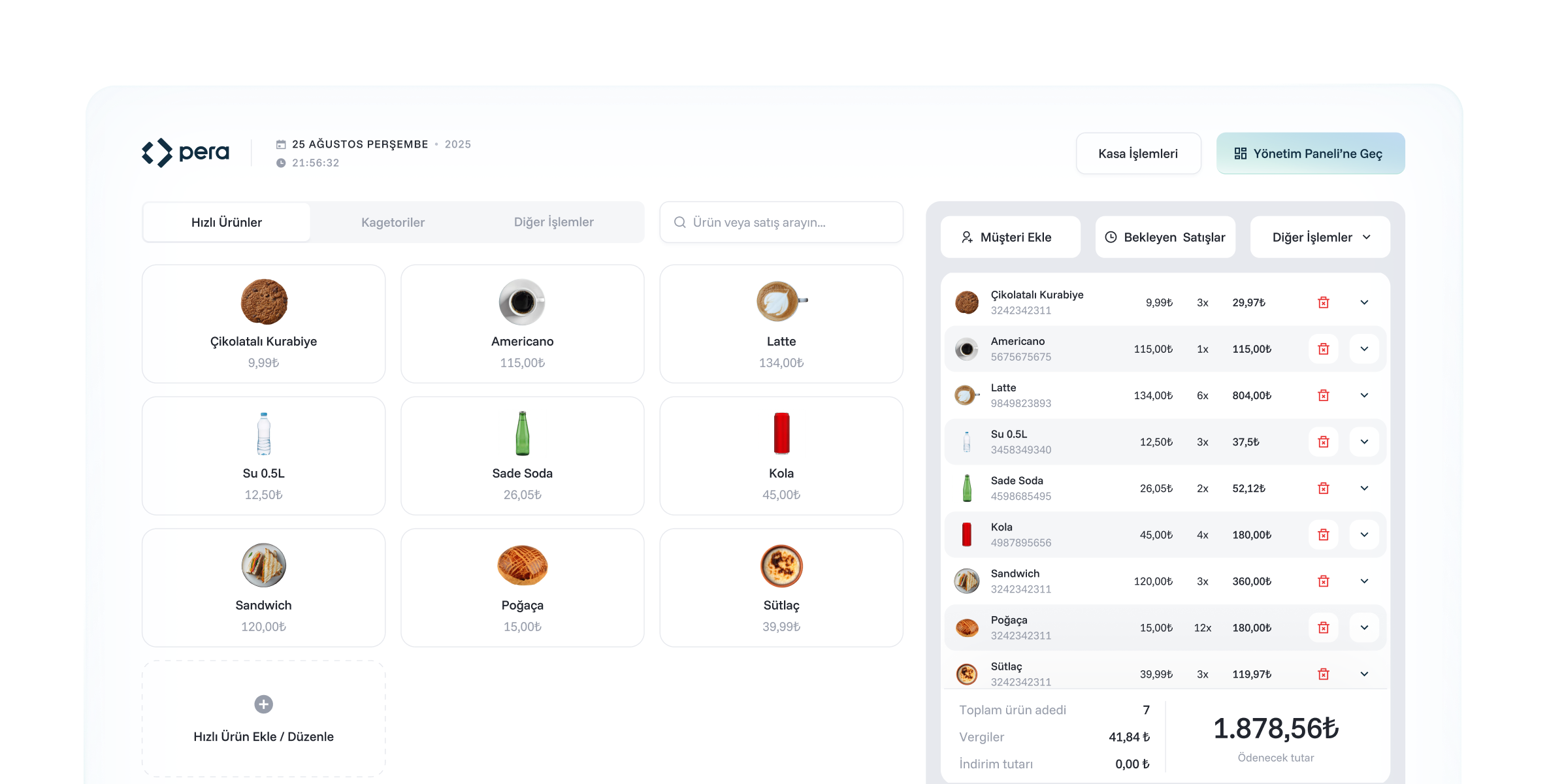 Kredi kartı ve nakit ödeme alma özelliğine sahip Pera ile ödemeleri hızlı, temassız ve güvenli şekilde tamamlayın. Stoklarınızı anlık takip ederek operasyonel süreçleri kolaylaştırın.